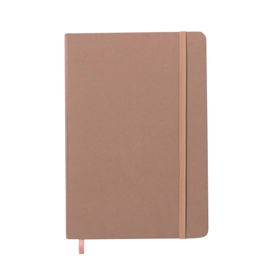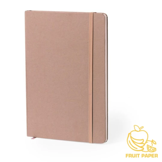 Notatnik A5 (80 kartek w linie), wykonany z kartonu z recyklingu i papieru z owoców, twarda okładka, tasiemka zakładkowa i elastyczna opaska do zamykania