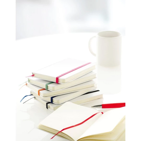 Notatnik (ok. A6, 80 pustych kartek), tasiemka zakładkowa, specjalna okładka pod znakowanie full colour, elastyczna opaska do zamykania