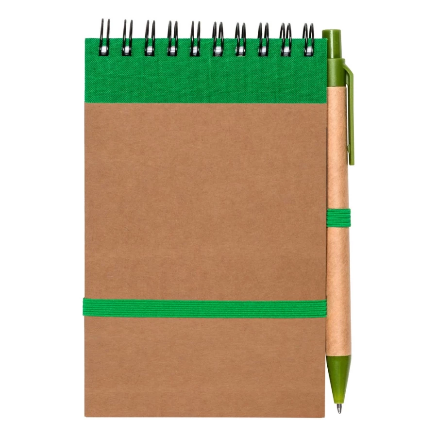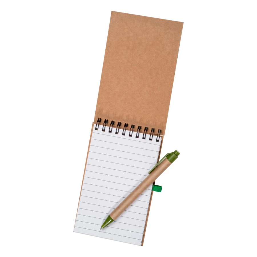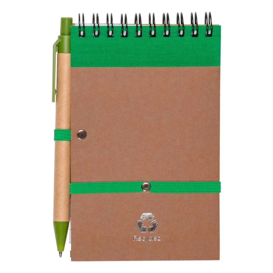Notatnik reporterski w kieszonkowym formacie ok. A6, posiada 70 kartek w linie (140 stron) i spiralne bindowanie, dodatkowe zamknięcie w postaci dopasowanej kolorystycznie elastycznej opaski, w komplecie znajduje się długopis z kolorowymi elementami, wkład w niebieskim kolorze, produkt wykonany między innymi z kartonu