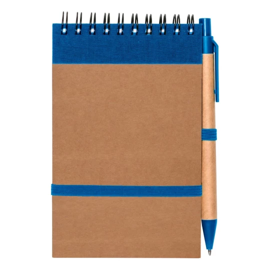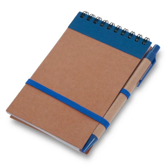 Notatnik reporterski w kieszonkowym formacie ok. A6, posiada 70 kartek w linie (140 stron) i spiralne bindowanie, dodatkowe zamknięcie w postaci dopasowanej kolorystycznie elastycznej opaski, w komplecie znajduje się długopis z kolorowymi elementami, wkład w niebieskim kolorze, produkt wykonany między innymi z kartonu