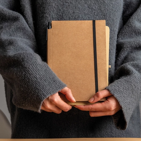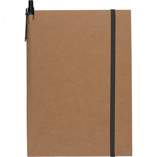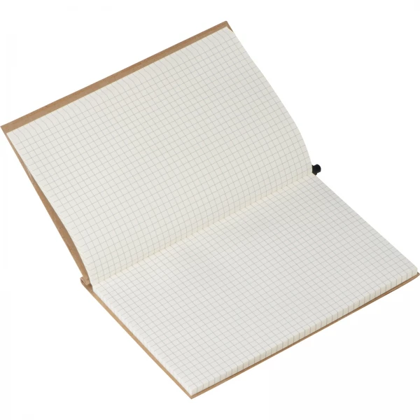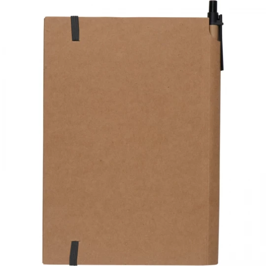 Notes (160 stron w kratkę) z ekologiczną okładką z kartonu i gumką. W zestawie z długopisem.
