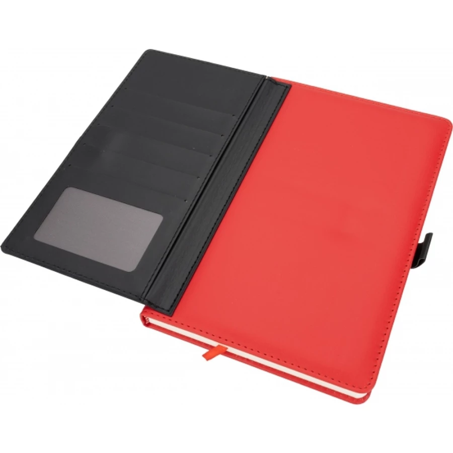Notatnik A5 w okładce z PU, ze 128 kartkami w linie, miejscem na długopis i wizytownikiem na 5 wizytówek.