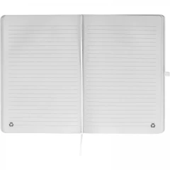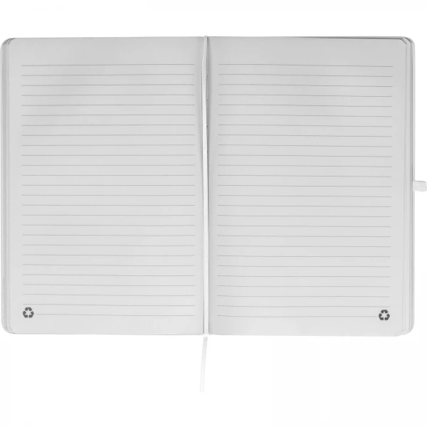 Notes o formacie A5, z okładką wykonaną z PU pochodzącego z recyklingu, posiada 192 strony w linie, zamknięcie na gumkę, materiałową zakładkę i pętelkę na długopis.