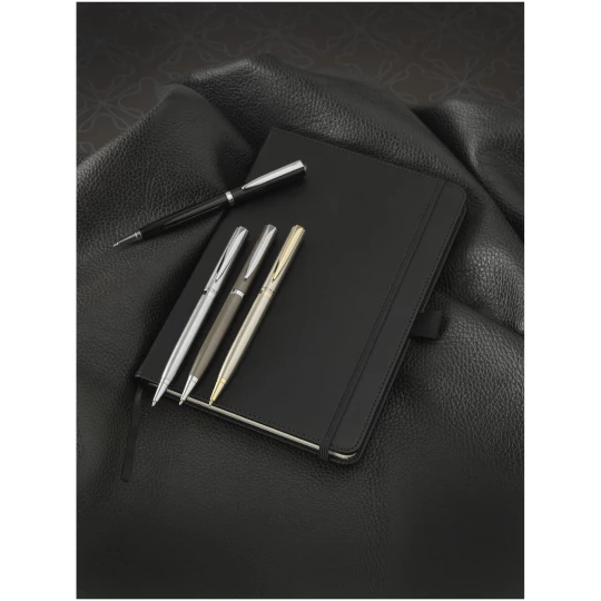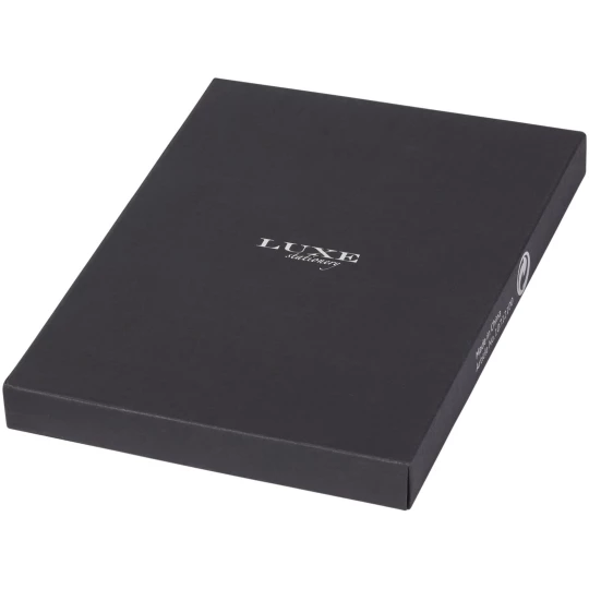 Notatnik (formatu A5), 80 kartek, wyjątkowe wzornictwo 80g/m2, papier kremowy w linie, z tyłu kieszonka na notatki oraz pętla na długopis. Zapakowany w pudełko upominkowe "LUXE".