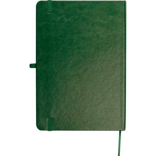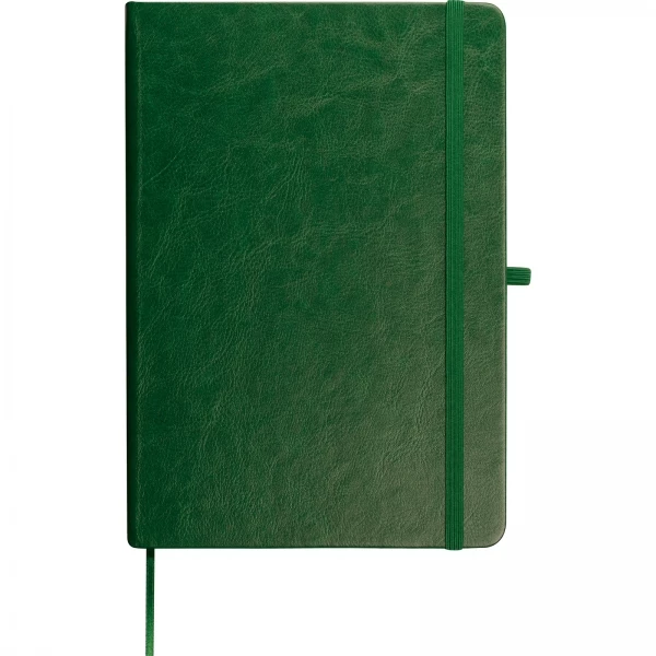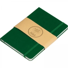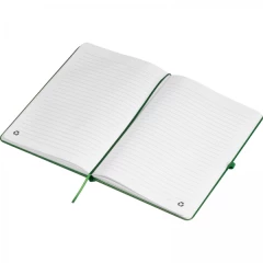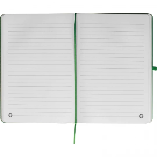 Notes o formacie A5, z okładką wykonaną z PU pochodzącego z recyklingu, posiada 192 strony w linie, zamknięcie na gumkę, materiałową zakładkę i pętelkę na długopis.