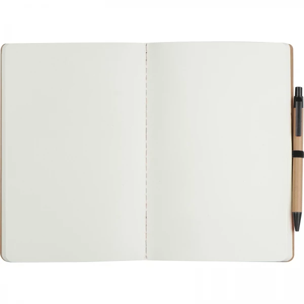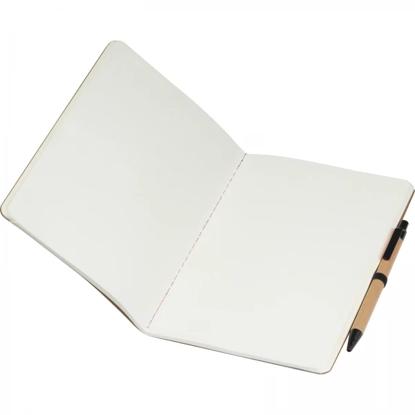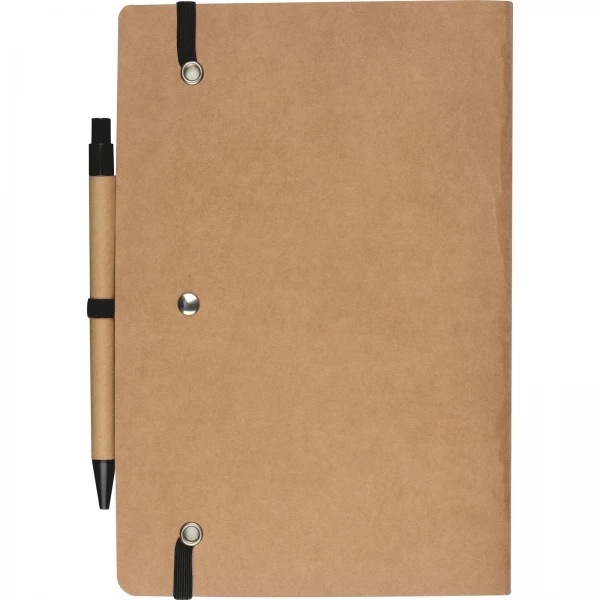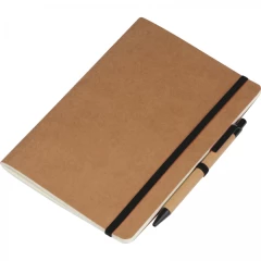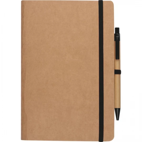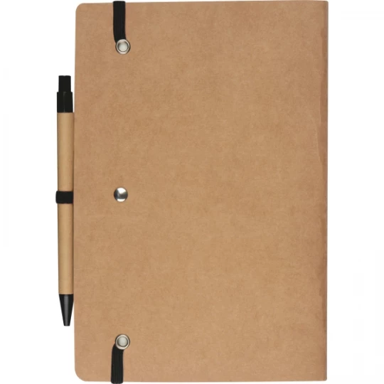 Notes o formacie A5, wykonany z papieru pochodzącego z recyklingu, posiada 120 czystych stron, zamknięcie na gumkę i długopis z niebieskim wkładem.