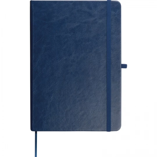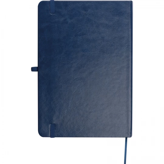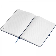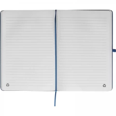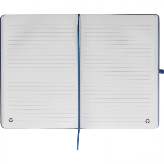 Notes o formacie A5, z okładką wykonaną z PU pochodzącego z recyklingu, posiada 192 strony w linie, zamknięcie na gumkę, materiałową zakładkę i pętelkę na długopis.