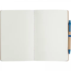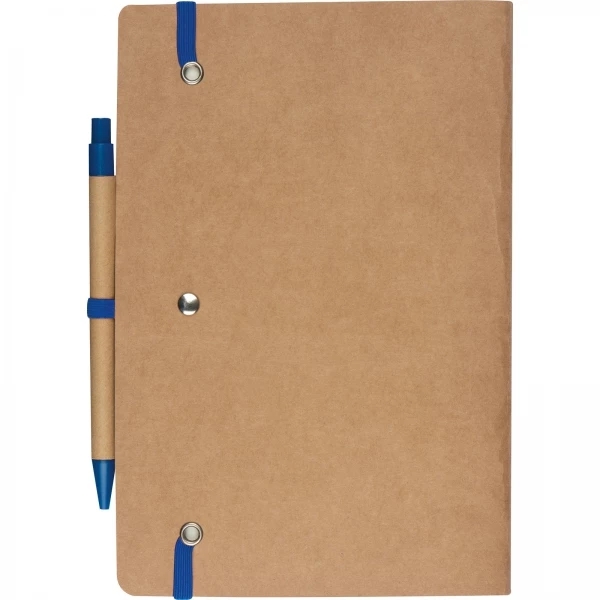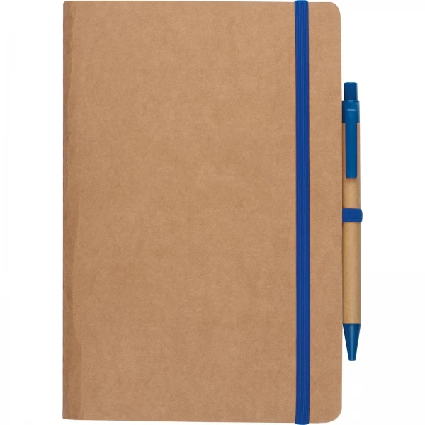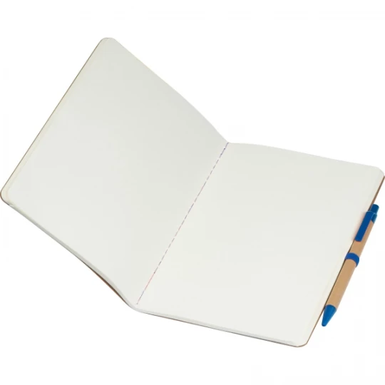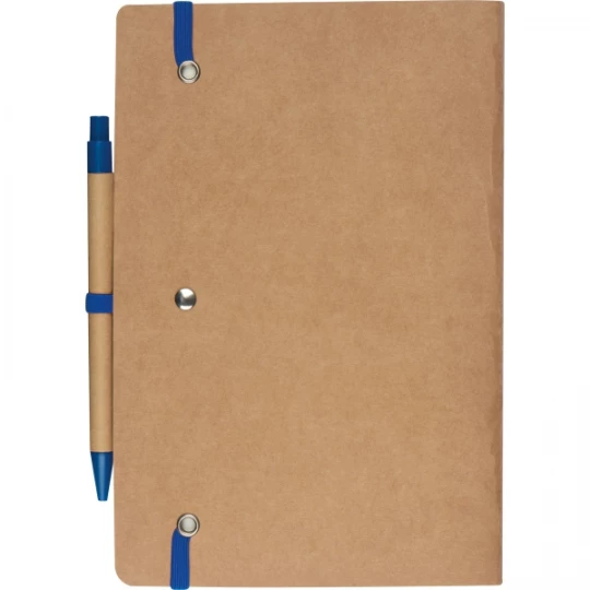 Notes o formacie A5, wykonany z papieru pochodzącego z recyklingu, posiada 120 czystych stron, zamknięcie na gumkę i długopis z niebieskim wkładem.
