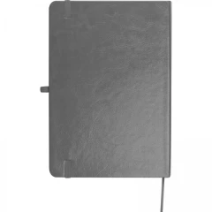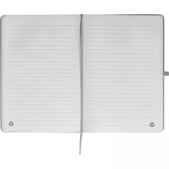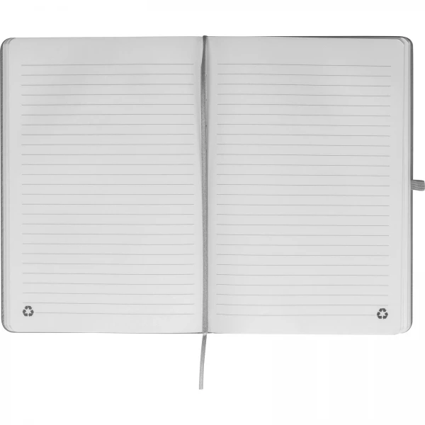 Notes o formacie A5, z okładką wykonaną z PU pochodzącego z recyklingu, posiada 192 strony w linie, zamknięcie na gumkę, materiałową zakładkę i pętelkę na długopis.