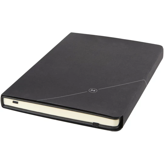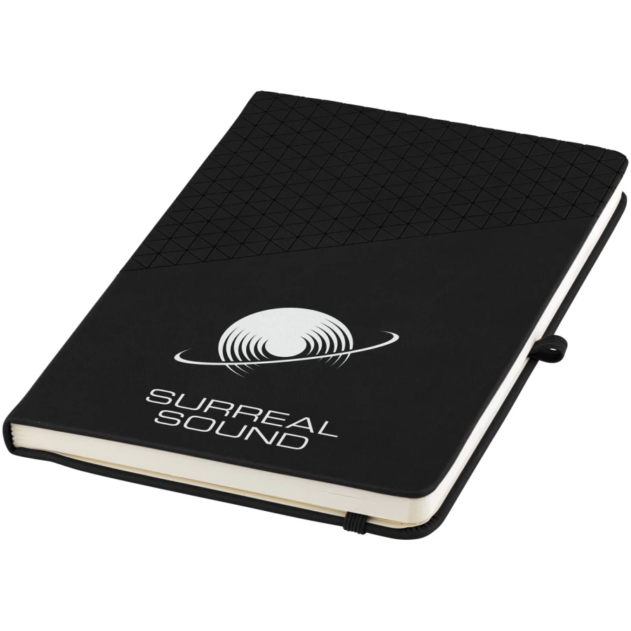 Delikatny w dotyku notes A5 z geometrycznym wzorem. Zawiera 80 kartek (80 gsm) papieru w linie, wstążkę, elastyczne zamknięcie i pętęlkę na długopis.