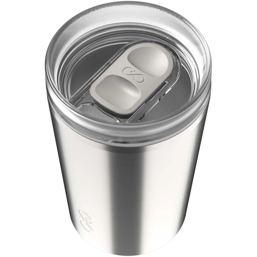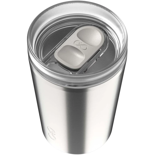 Ocean Bottle izolowany kubek o pojemności 350 ml z podwójnie izolowanymi ściankami, dzięki czemu utrzymuje temperaturę gorących napojów nawet przez cztery godziny, a zimnych nawet przez dziesięć godzin. Bez problemu mieści się pod większością ekspresów do kawy, a także w większości samochodowych uchwytów na kubki. Każdy kubek podróżny jest całkowicie neutralny pod względem emisji dwutlenku węgla i odpowiada za zebranie 1000 plastikowych butelek, aby poprawić warunki życia społeczności przybrzeżnych. Kubek wykonany jest w 90% ze stali nierdzewnej pochodzącej z recyklingu i innych materiałów pochodzących z recyklingu. Zapakowany w pudełko upominkowe wykonane z kartonu z recyklingu.