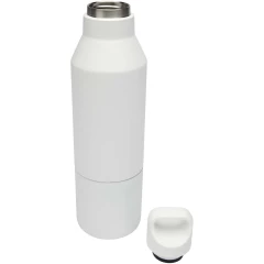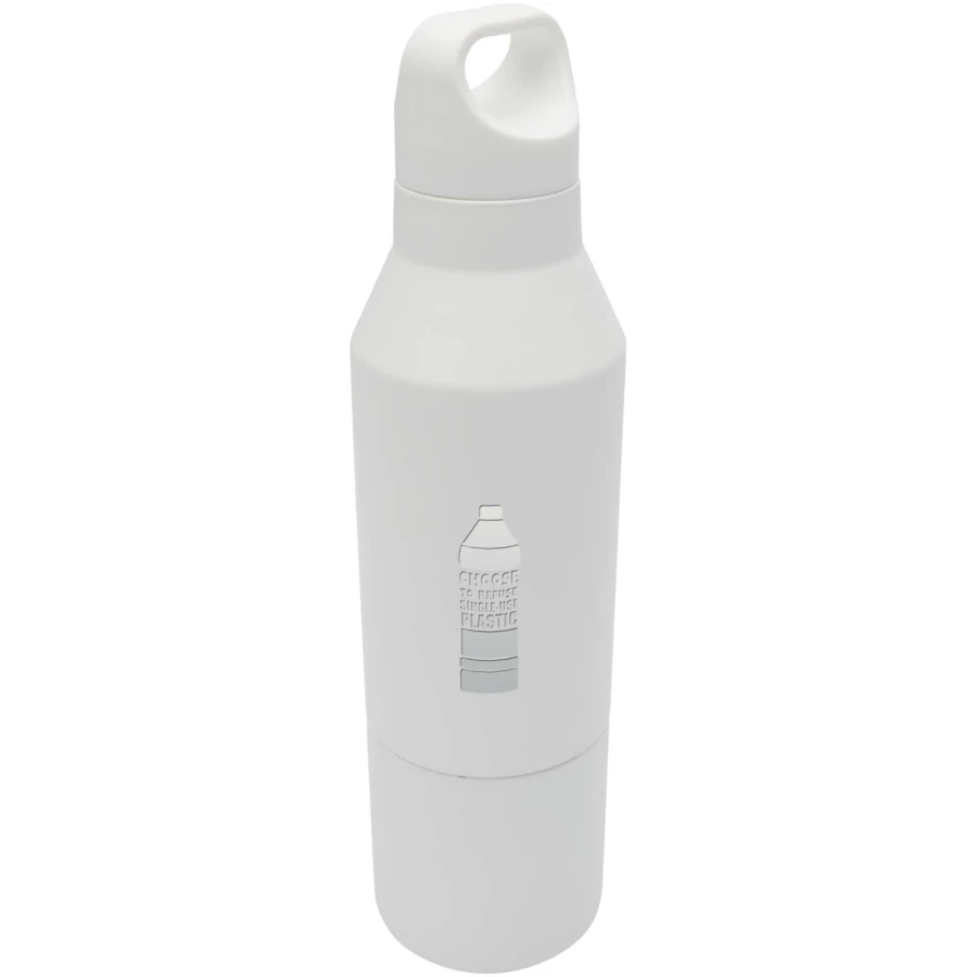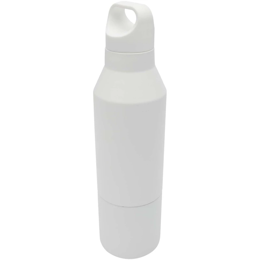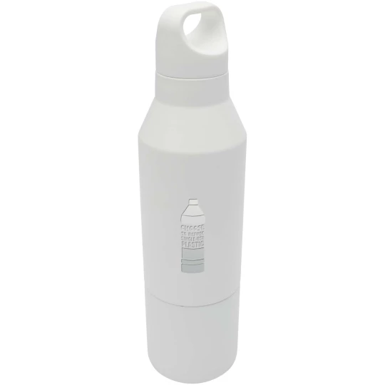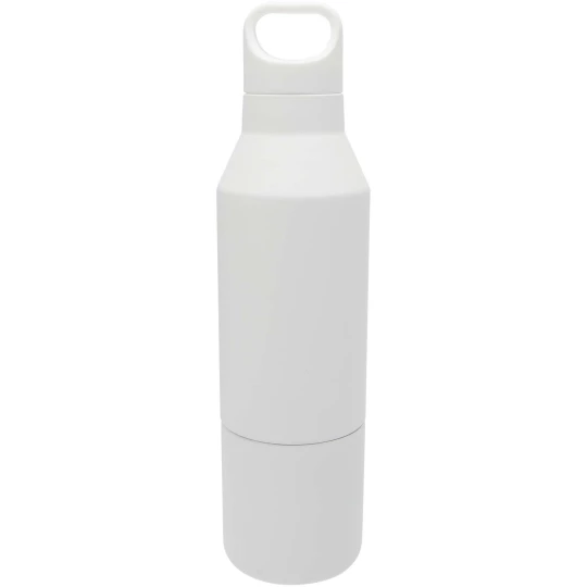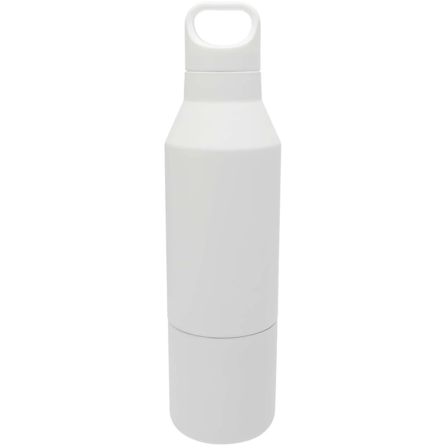 Izolowana butelka z podwójnymi ściankami ze stali nierdzewnej z powłoką miedzianą z certyfikatem RCS i zdejmowanym kubkiem. Ta wielofunkcyjna butelka została zaprojektowana tak, aby zmieścić się w bocznej kieszeni plecaka. Posiada wygodny uchwyt do przenoszenia zintegrowany z zakrętką. Trwała powłoka proszkowa na zewnątrz. Utrzymuje temperaturę napojów gorących do 12 godzin lub zimnych do 24 godzin. Zapakowana w pudełko upominkowe wykonane z kartonu z recyklingu. Pojemność butelki: 600 ml. Pojemność kubka: 300 ml.