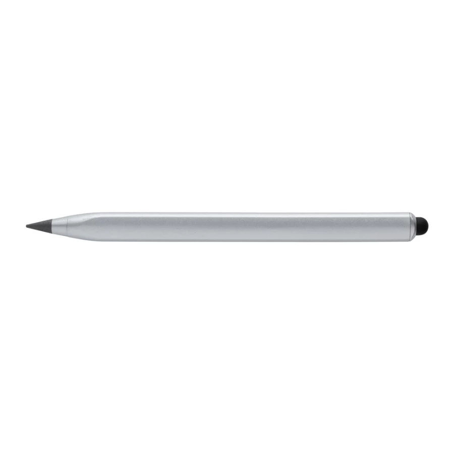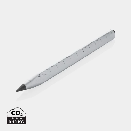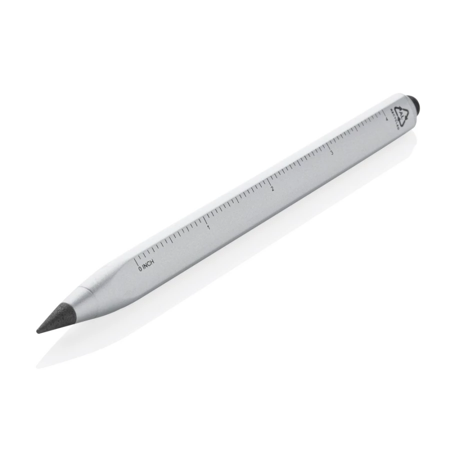 Ołówek, linijka, touch pen, wykonany aluminium z recyklingu, dzięki wykorzystaniu specjalnej wolnościerającej się grafitowej końcówki długość pisania ołówka to około 20 000 metrów w porównaniu z tradycyjnym ołówkiem którego długość pisania to około 200 metrów, notatki można zmazać standardową gumką do mazania, ślad węglowy produktu: 0,1 kg CO2