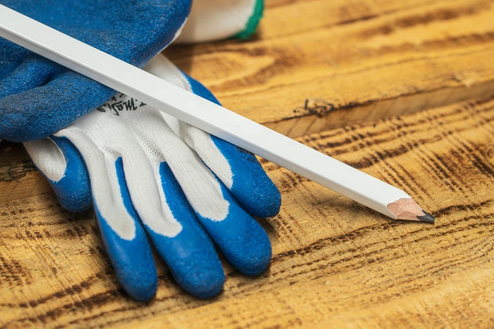 Drewniany, prostokątny ołówek stolarski z grafitowym wkładem HB. Nie jest zatemperowany.