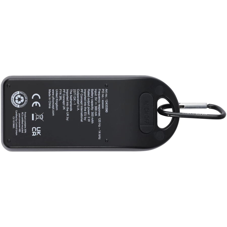 Głośnik Bluetooth® z certyfikatem RCS o mocy 3 W, odtwarzający muzykę, podcasty itp. z dowolnego urządzenia obsługującego technologię Bluetooth®, co czyni go idealnym towarzyszem na każdą okazję. Dzięki dołączonemu karabińczykowi głośnik można z łatwością przymocować do plecaka, a stopień ochrony IPX4 chroni go przed sporadycznym deszczem. Bateria litowo-jonowa o pojemności 300 mAh zapewnia do 1,5 godziny słuchania muzyki przy maksymalnej głośności. Czas ładowania wynosi 1,5 godziny. Bluetooth® 5.0 z zasięgiem roboczym wynoszącym około 10 metrów. Dostarczany z instrukcją obsługi, karabińczykiem, kablem ładującym USB-A do USB typu C o długości 50 cm i zapakowany w pudełko z papieru Kraft pochodzącego w 100% z recyklingu.