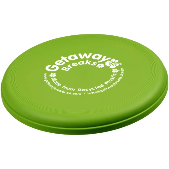 Frisbee wykonane w 100% z tworzyw sztucznych pochodzących z recyklingu, łączy zabawny pomysł promocyjny ze sprawdzonymi certyfikatami zrównoważonego rozwoju. Wykonane w Wielkiej Brytanii i zgodne ze standardem EN72. Ze względu na charakter materiału pochodzącego z recyklingu frisbee może mieć plamki. Nieodpowiednie dla dzieci poniżej trzeciego roku życia. Średnica: 23 cm.