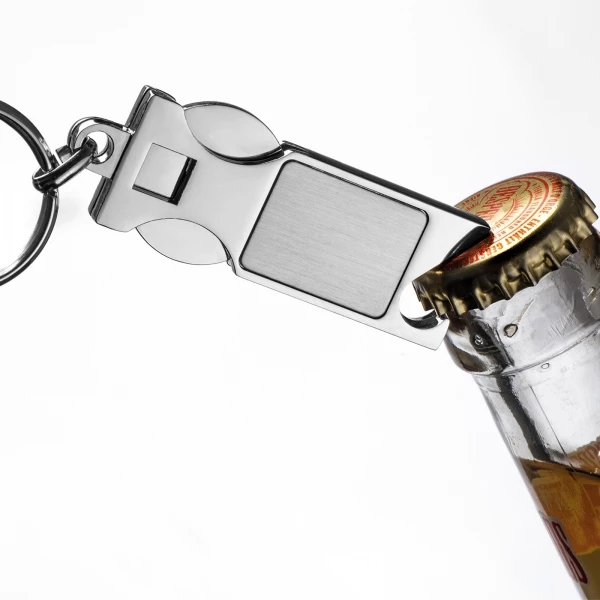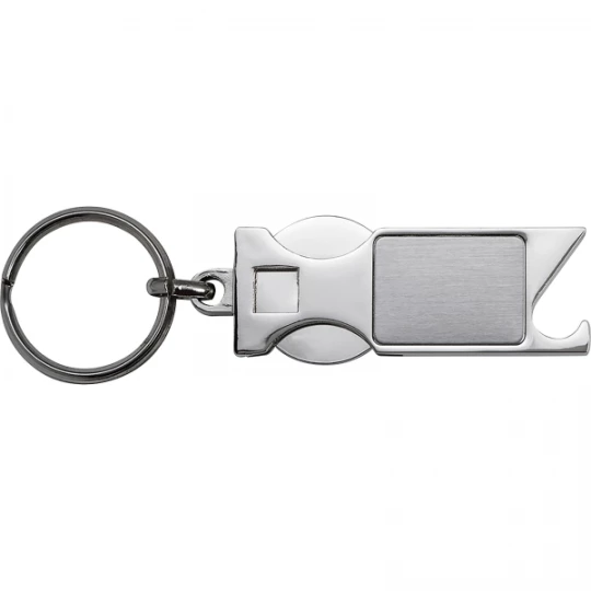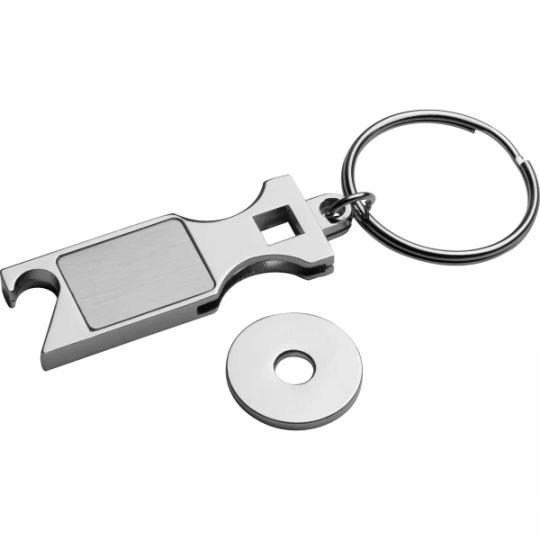 Metalowy otwieracz do butelek z żetonem do wózka i brelokiem.