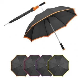 Elegancki parasol automatyczny wykonany z PU, metalu i materiału pongee. Parasol posiada miękki, prosty uchwyt.