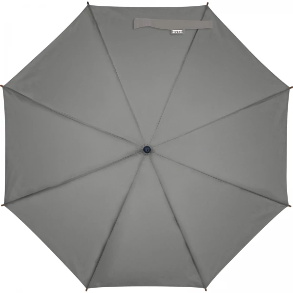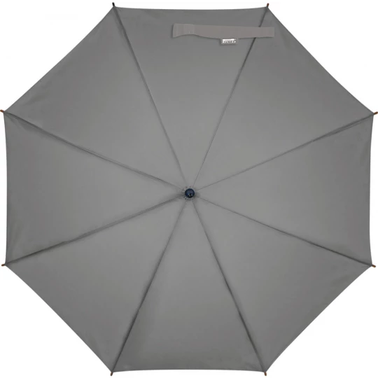 Automatyczny, wiatroodporny parasol, ze stelażem z włókna szklanego, panelami z poliestru RPET pochodzącego z recyklingu oraz zakrzywioną rączką z drewna.