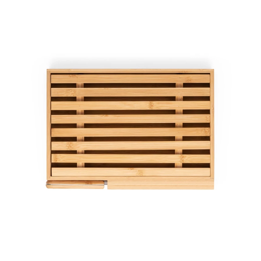 Deska do chleba z bambusa z dołączonym nożem ze stali nierdzewnej. Wyjmowana kratka umożliwia łatwe usuwanie okruchów. Dostarczana w pudełku upominkowym z papieru kraft. Ponieważ produkt jest wykonany z naturalnych materiałów, kolor produktu oraz wynik drukowania mogą się różnić w zależności od produktu. 350 x 250 x 40 mm