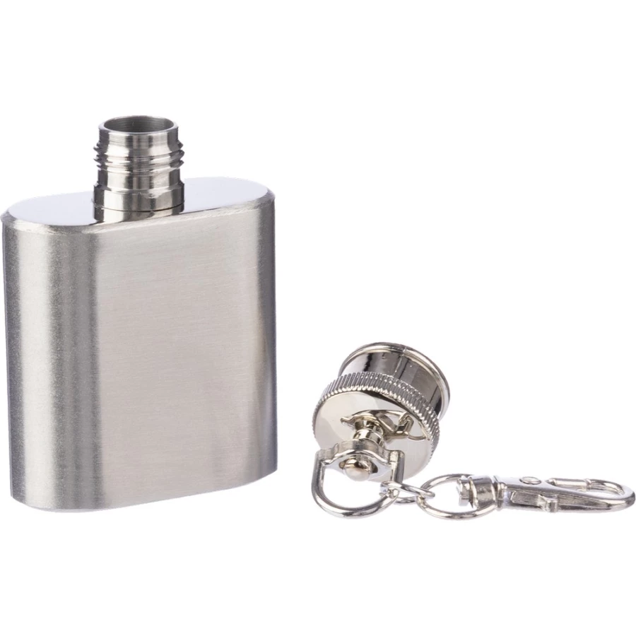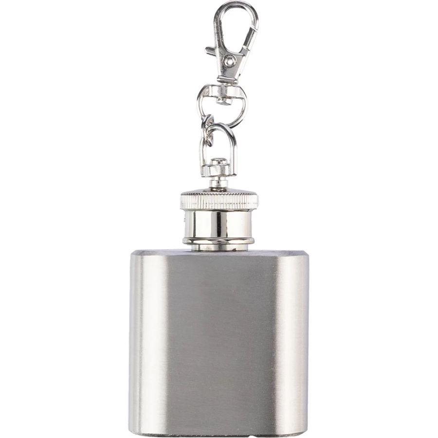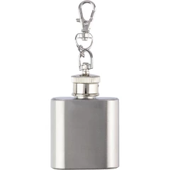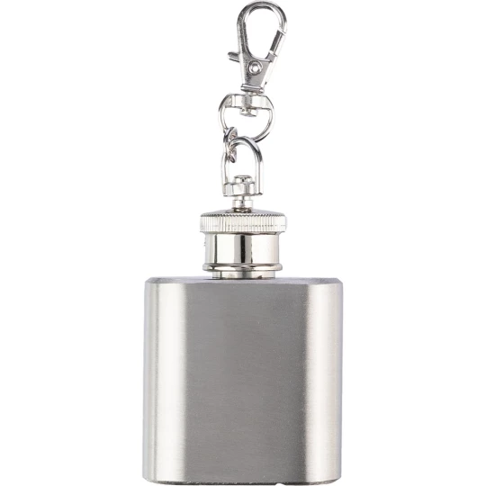 Brelok do kluczy "piersiówka" 30 ml, z karabińczykiem umożliwiającym przypinanie, produkt wykonany ze stali nierdzewnej