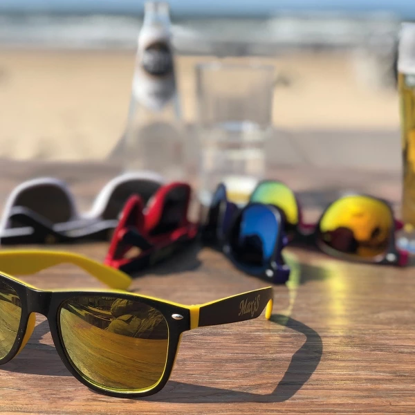 Okulary przeciwsłoneczne z plastiku z dwukolorowymi oprawkami oraz lustrzanymi soczewkami nawiązującymi odcieniem do koloru oprawek (UV400, 3 kategoria ochrony).