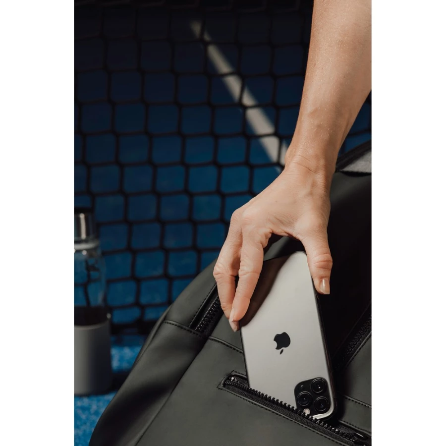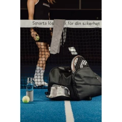 Plecak, przestronna przegroda główna z mniejszymi kieszeniami wewnątrz, z boku 2 przegrody na rakiety do gry w padla, kieszeń na buty, plecak może być używany jako torba sportowa, miękkie i regulowane paski na ramiona