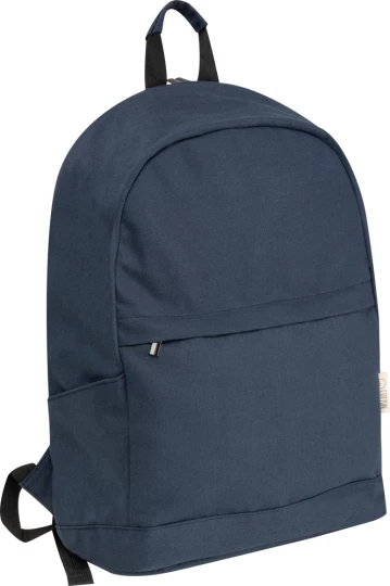 Plecak wykonany z bawełny pochodzącej z recyklingu, posiada watowane plecy i szelki, kieszeń na laptopa, dużą kieszeń wewnętrzną oraz frontową kieszonkę zapinaną na zamek.