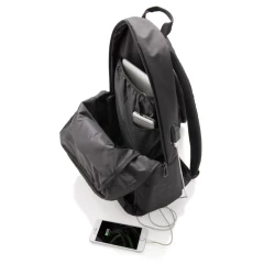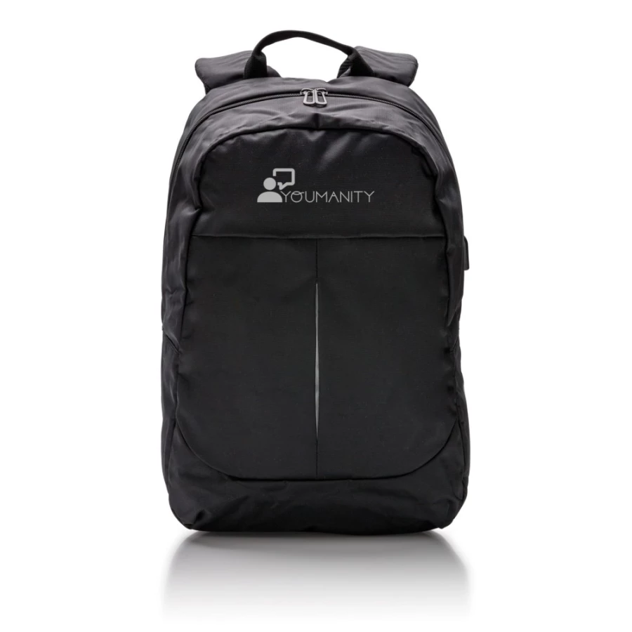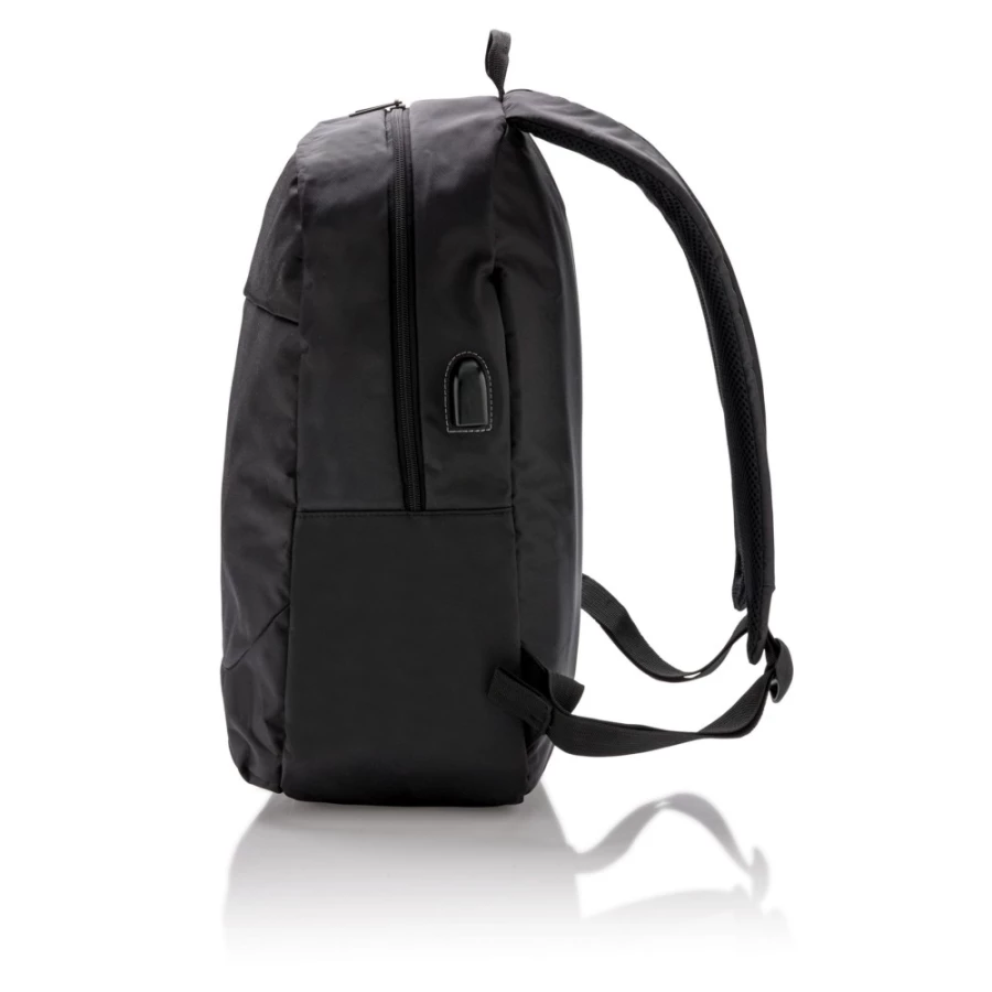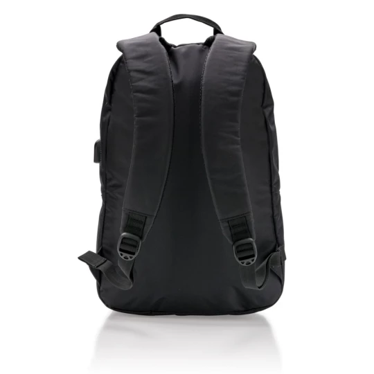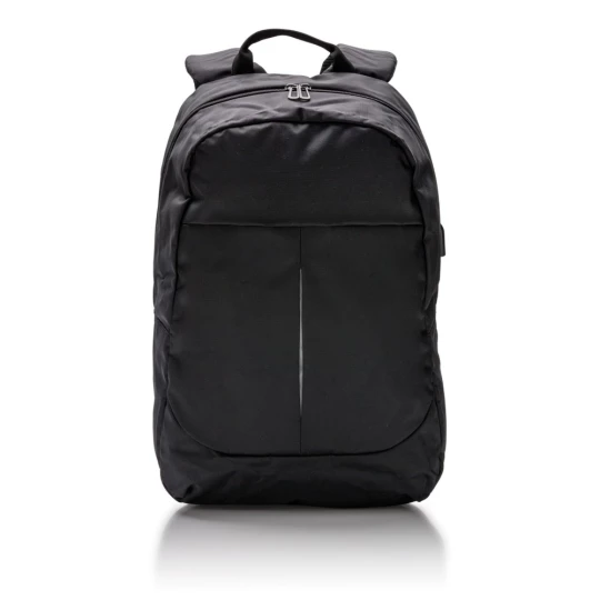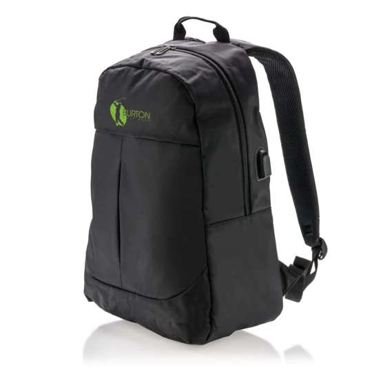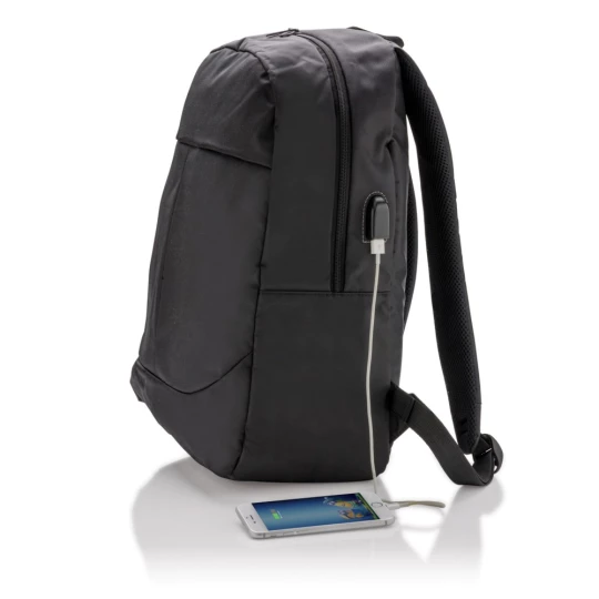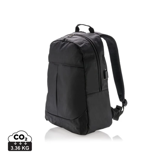Plecak na laptopa 15", wykonany z poliestru 600D, posiada wyjście USB do ładowania (power-bank nie jest dołączony), ślad węglowy produktu: 3,36 kg CO2