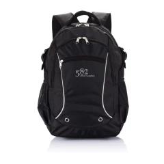 Plecak na laptopa 15,6", wykonany z poliestru 1680D i żakardu, przednia kieszeń z organizerem na zamek błyskawiczny, przegroda główna na laptopa do 15,6", odblaskowe elementy, siateczkowe kieszonki po obu stronach, nie zawiera PVC, ślad węglowy produktu: 7,77 kg CO2