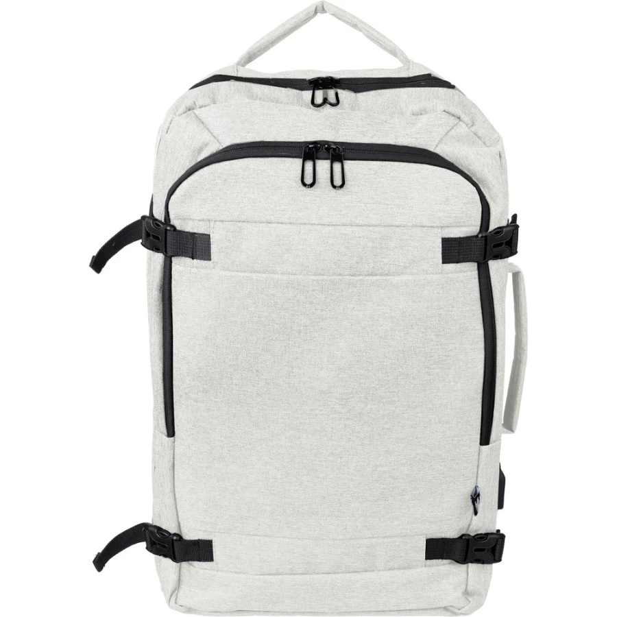 Plecak na laptopa 17" z podszewką wewnątrz, pojemność plecaka to 1 l, uchwyty do noszenia w dłoni lub powieszenia plecaka znajdują się na górze i z boku, dwie duże przegrody zapinane na zamek, jedna z przegrodą na laptopa 17", zamykana gumką zapinaną na rzep, a druga zawiera kilka małych przegródek, z przodu mała kieszonka zapinana na zamek, wentylowane, wyściełane wnętrze, z tyłu pasek do wózka i kieszeń zabezpieczająca przed kradzieżą, posiada otwór USB-A z boku do podłączenia telefonu do powerbanku wewnątrz plecaka (brak w zestawie), ikona RPET na metce, produkty wykonany z RPET, poliestru, siatki i pianki