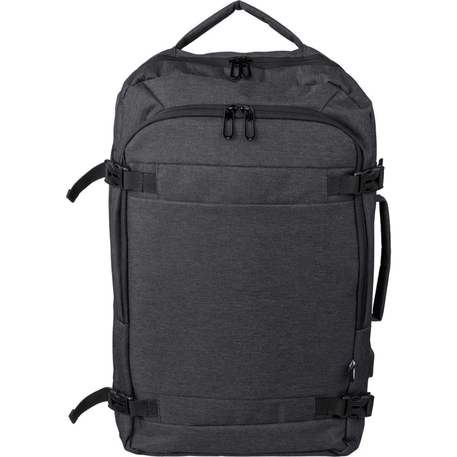 Plecak na laptopa 17" z podszewką wewnątrz, pojemność plecaka to 1 l, uchwyty do noszenia w dłoni lub powieszenia plecaka znajdują się na górze i z boku, dwie duże przegrody zapinane na zamek, jedna z przegrodą na laptopa 17", zamykana gumką zapinaną na rzep, a druga zawiera kilka małych przegródek, z przodu mała kieszonka zapinana na zamek, wentylowane, wyściełane wnętrze, z tyłu pasek do wózka i kieszeń zabezpieczająca przed kradzieżą, posiada otwór USB-A z boku do podłączenia telefonu do powerbanku wewnątrz plecaka (brak w zestawie), ikona RPET na metce, produkty wykonany z RPET, poliestru, siatki i pianki