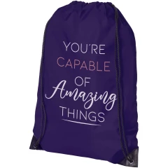 Plecak Oriole jest łatwy do wręczenia jako prezent promujący markę lub kampanię marketingową. Ten lekki plecak jest przyjazny dla budżetu, łatwy do noszenia na plecach lub na ramieniu i oferuje wystarczająco dużo miejsca na dodanie logo lub innych wiadomości. Sznurek ściągający ułatwia otwieranie i zamykanie, a materiał poliestrowy 210D jest mocny i trwały.