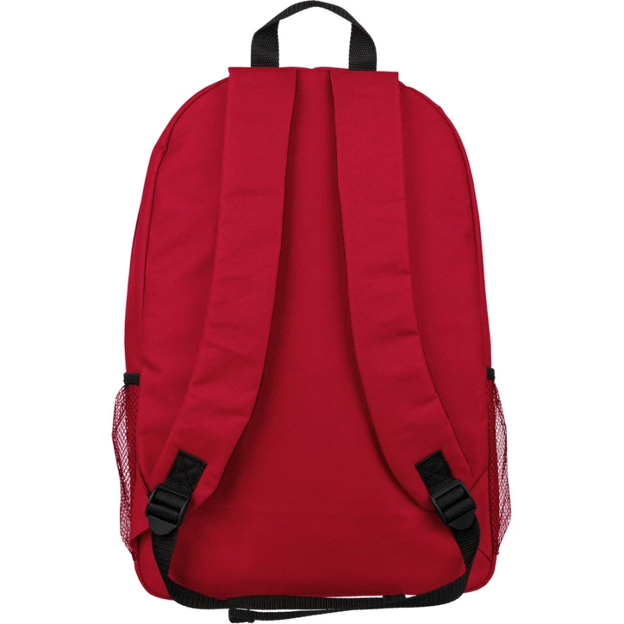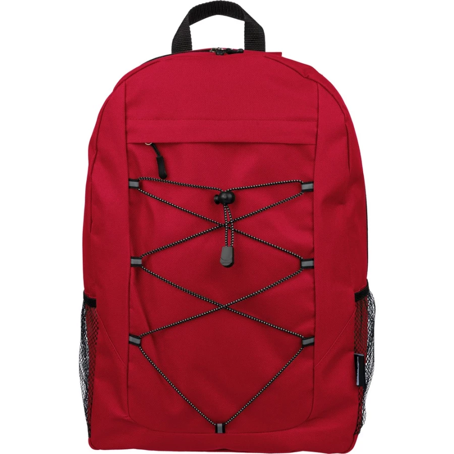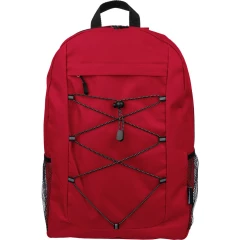 Plecak podróżny, siatkowate kieszenie po obu stronach, elastyczne sznurki z przodu do przymocowania butelki albo koca, zaciskane zamknięcie, mała kieszeń zapinana na zamek z przodu, kieszeń główna zapinana na zamek, ikona RPET na metce, produkt wykonany z RPET, poliestru i elastanu
