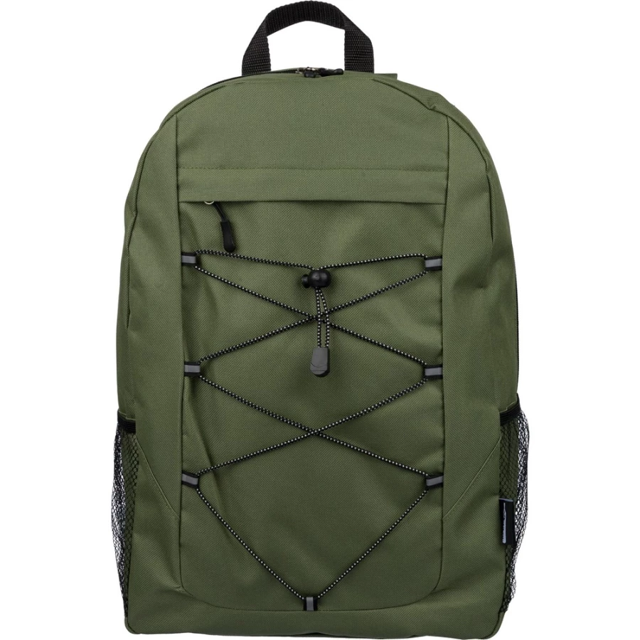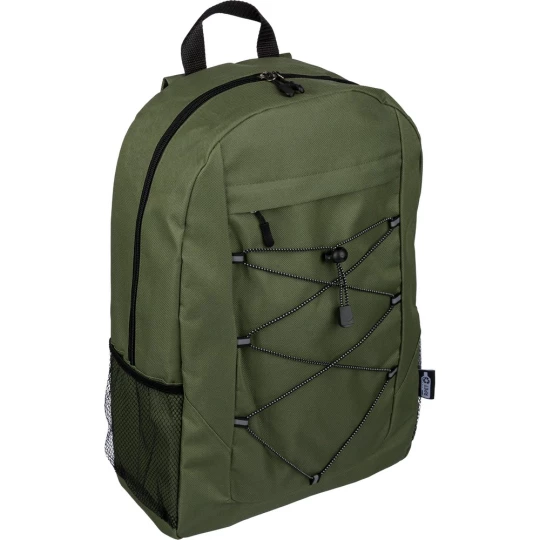 Plecak podróżny, siatkowate kieszenie po obu stronach, elastyczne sznurki z przodu do przymocowania butelki albo koca, zaciskane zamknięcie, mała kieszeń zapinana na zamek z przodu, kieszeń główna zapinana na zamek, ikona RPET na metce, produkt wykonany z RPET, poliestru i elastanu