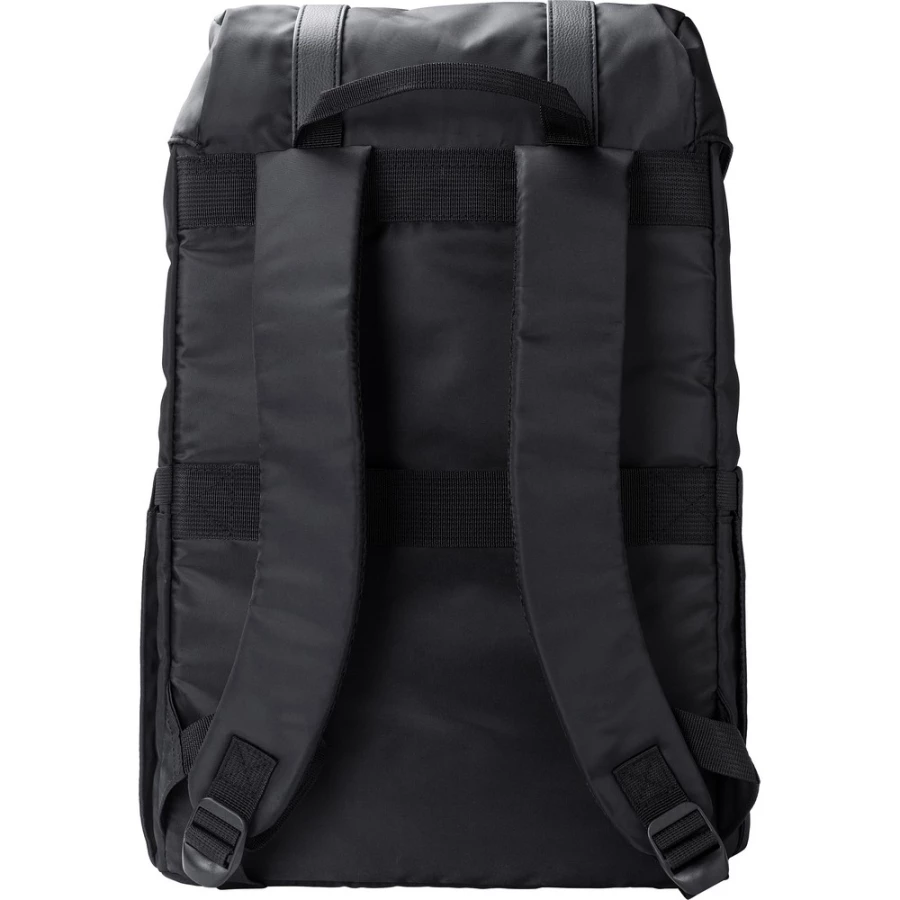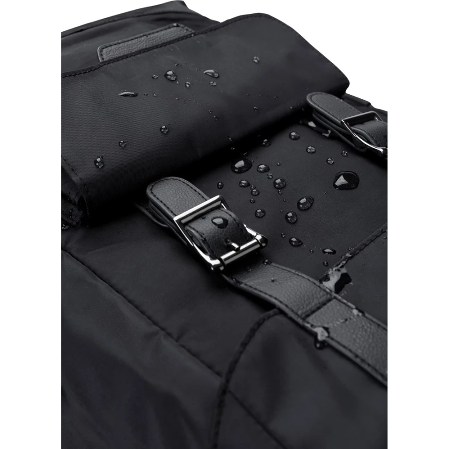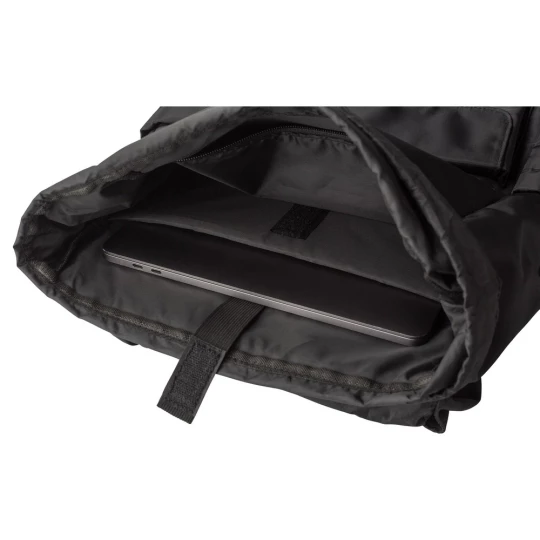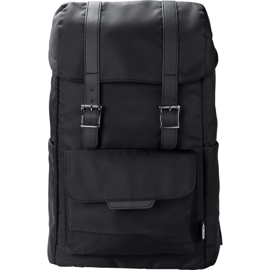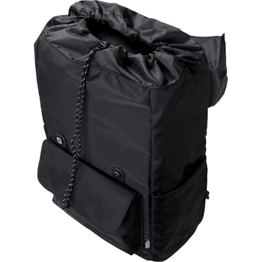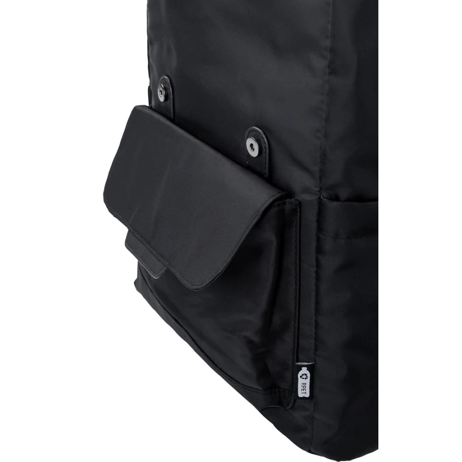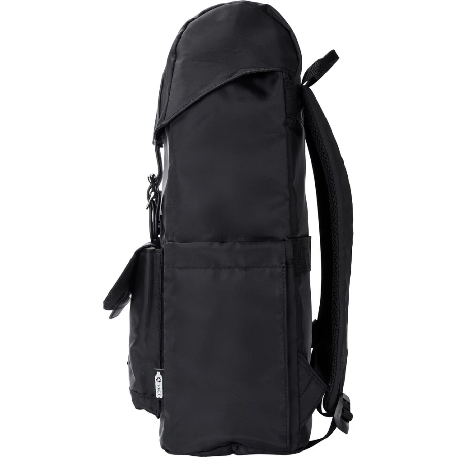 Plecak z klapą wykonany z RPET, dwie kieszenie boczne, przednia kieszeń zamykana na magnes, wnętrze zamykane na sznurek, kieszeń na laptopa 15", wodoodporna powłoka na torbie