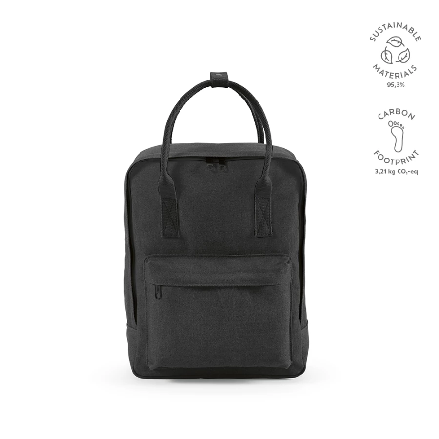 Wykonany z bawełnianego płótna z recyklingu (450 g/m²), ten plecak o pojemności 18 litrów jest przykładem zrównoważonego rozwoju. Posiada dwa uchwyty umieszczone dla większej wygody i paski na ramię z rPET. Posiada również przednią kieszeń. Zapakowany w torbę PE z recyklingu.