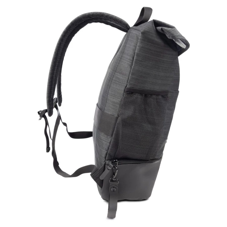 Plecak termoizolacyjny z przegrodą główną zamykaną na klamrę, pojemność: 15L, dolna przegroda termoizolacyjna mieszcząca do 8 puszek 0,33L zamykana na zamek błyskawiczny, boczna kieszeń siateczkowa, przednia kieszeń na rzep, na plecach kieszeń zamykana na zamek błyskawiczny, pasek do zamocowania na torbie podróżnej, miękki tył i regulowane paski na ramię