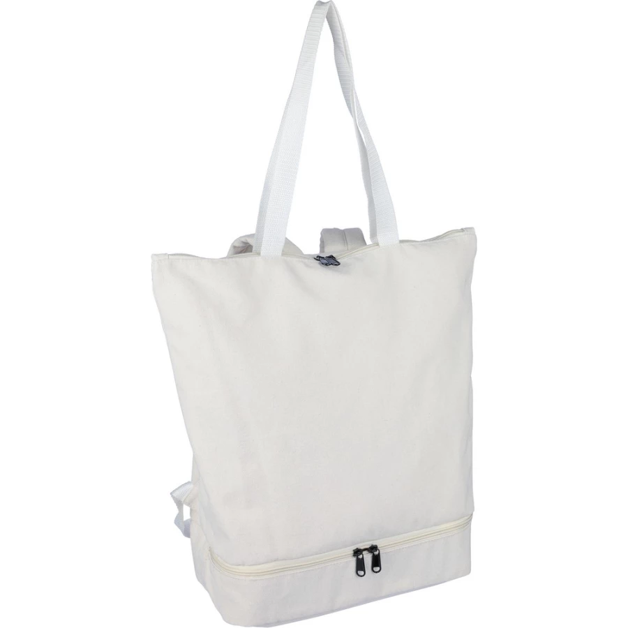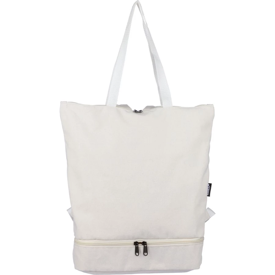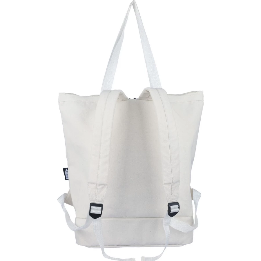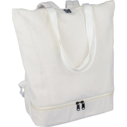 Plecak z funkcją torby na ramię, posiada dużą komorę zapinaną na zamek na górze, komorę zapinaną na zamek na dole, przegrodę na laptopa 15", dwie kieszenie wewnętrzne oraz jedną zewnętrzną kieszeń na zamek, konstrukcja obejmuje długie uchwyty do noszenia, wyściełane, regulowane szelki, pojemność: 30L, maksymalne obciążenie: 15 kg, produkt wykonany polibawełny z recyklingu (330 g/m²), podszewka z poliestru 210D