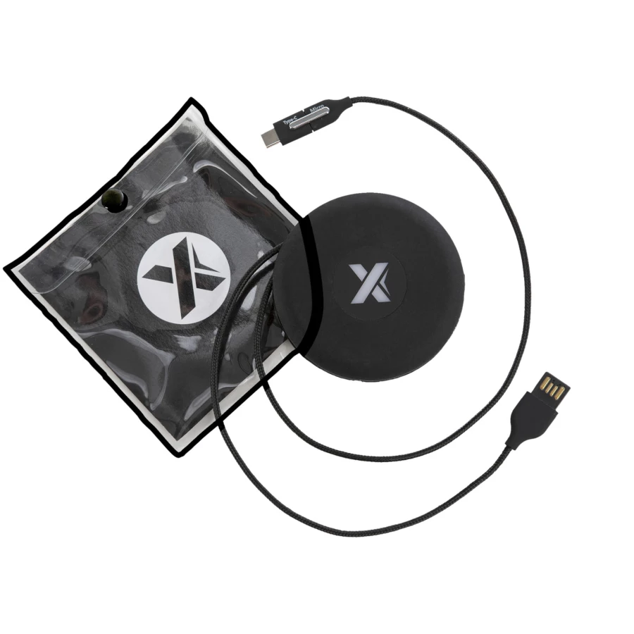 Kabel do ładowania w rolce wyposażony w trzy złącza (typu C, Android, iPhone). Produkt ten umożliwia również przesyłanie danych. Posiada silikonową torbę do przechowywania, dzięki czemu jest to doskonałe akcesorium do zabrania w podróż. Opakowanie wykonane jest z papieru i plastiku z recyklingu.