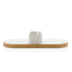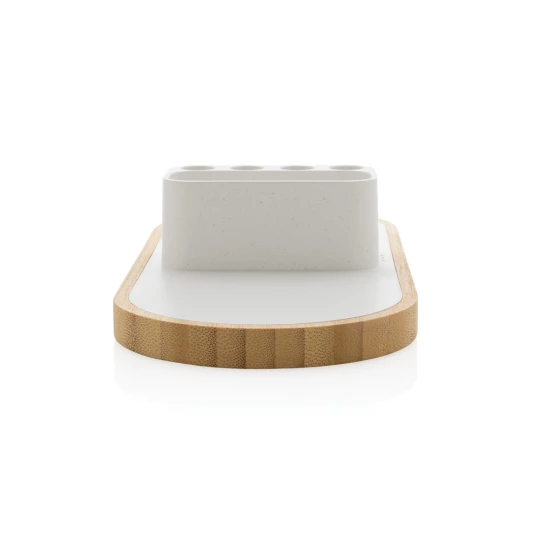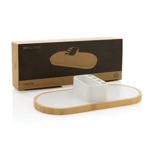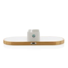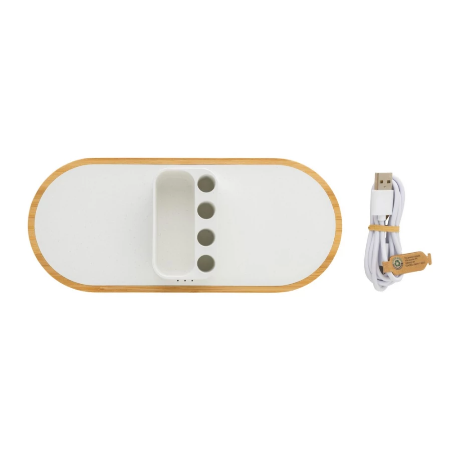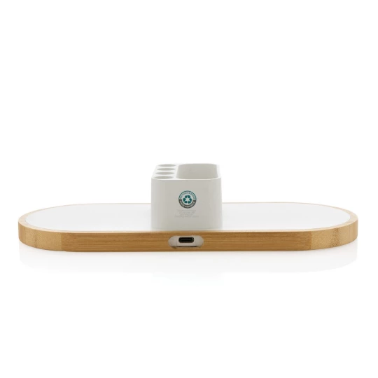 Podwójna ładowarka bezprzewodowa 10W, możliwość ładowania dwóch urządzeń jednocześnie, organizer, wykonana z materiałów pochodzących z recyklingu z certyfikatem RCS i bambusa z certyfikatem FSC®, zawartość materiałów z recyklingu obliczona na postawie wagi przedmiotu: 21%, działa z telefonami posiadającymi możliwość ładowania indukcyjnego, wejście USB typu C 5-9V/2A, wyjście 5-9V/1-1.1A, kabel w komplecie, wzór zastrzeżony®, ślad węglowy produktu: 0,93 kg CO2