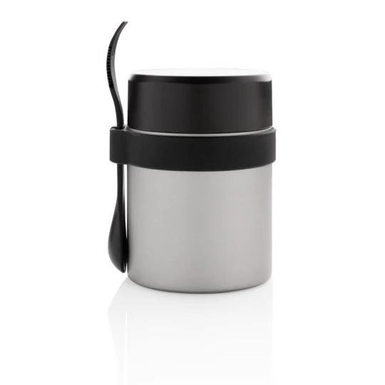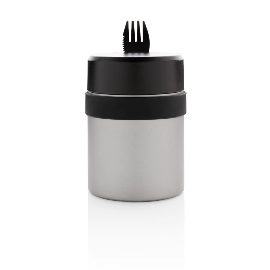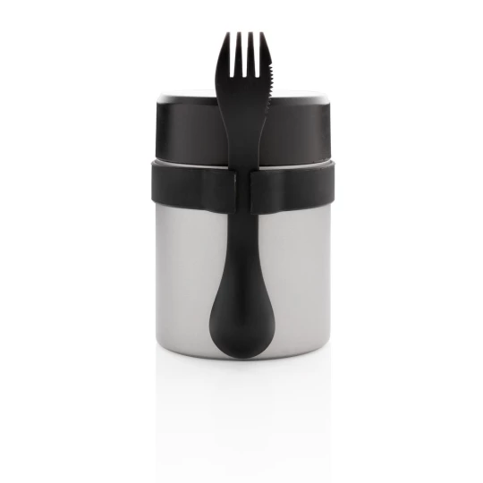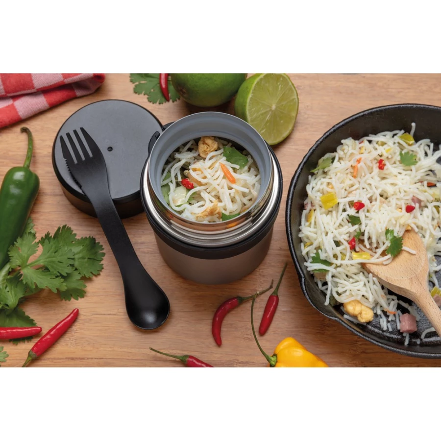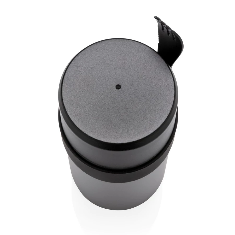 Próżniowy pojemnik na żywność 400 ml z powłoką ceramiczną na ścianie wewnętrznej eliminującą metaliczny posmak żywności, szczelne wieczko, utrzymuje temperaturę ciepłej żywności do 5 godzin oraz zimnej do 15 godzin, w zestawie sztućce 3 w 1 (widelec, nóż i łyżka), wzór zastrzeżony®, ślad węglowy produktu: 2,6 kg CO2