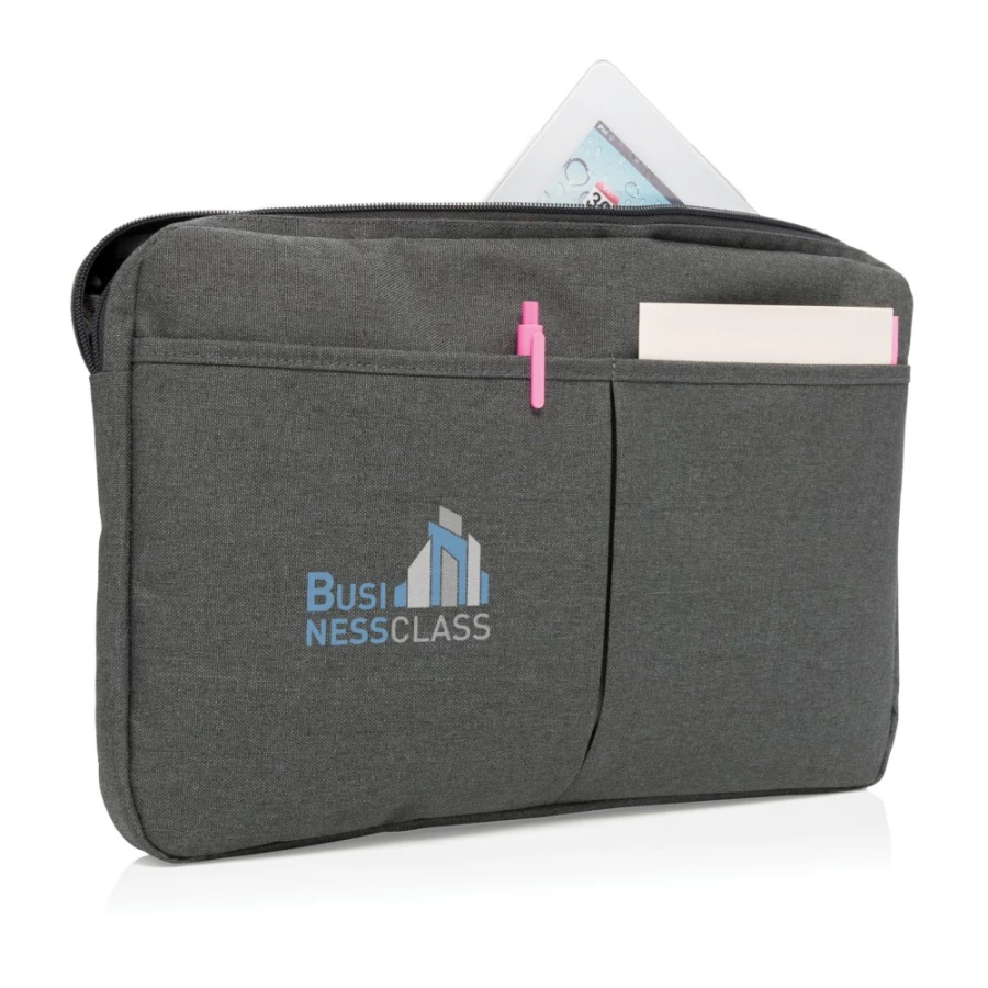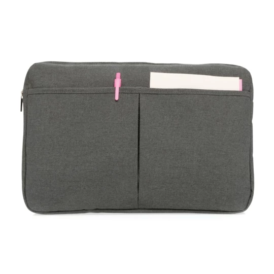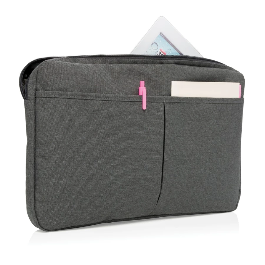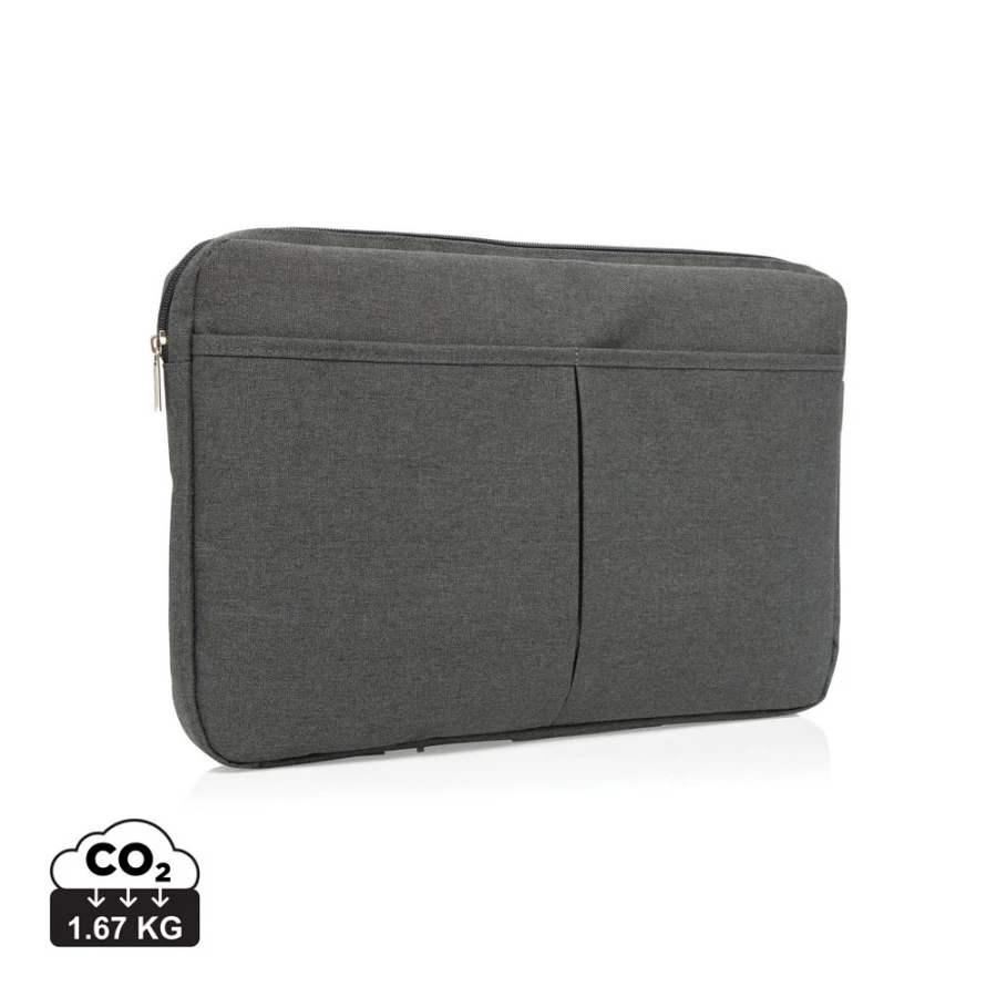Pokrowiec na laptopa 15", wykonany z poliestru 600D, posiada miejsce na ładowarkę, kable, klucze i inne akcesoria, nie zawiera PVC, ślad węglowy produktu: 1,67 kg CO2