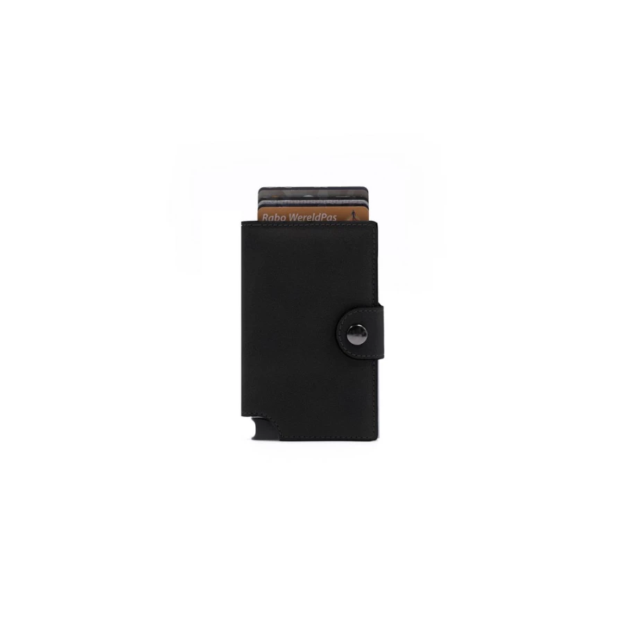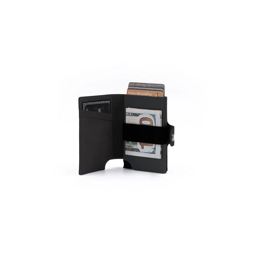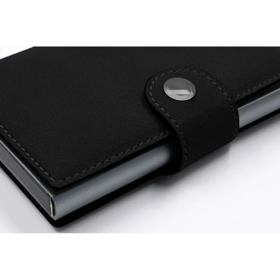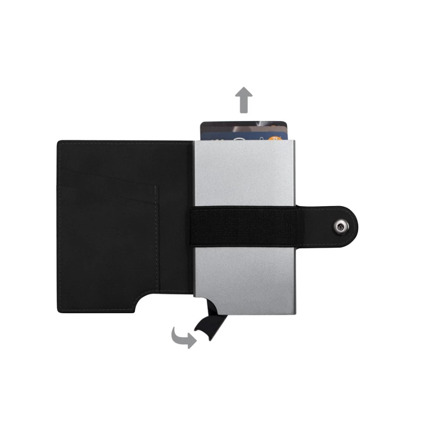 Portfel BrandCharger Wally Porto, przeznaczony do bezpiecznego przechowywania do 9 kart, z ochroną RFID, która zwiększa bezpieczeństwo danych, wykonany z podkładki zapobiega zginaniu się i łamaniu, zmieści się w każdej kieszeni, mechanizm wysuwający kartę z portfela, zapakowany w ozdobne pudełko kartonowe, produkt wykonany z aluminium i PU