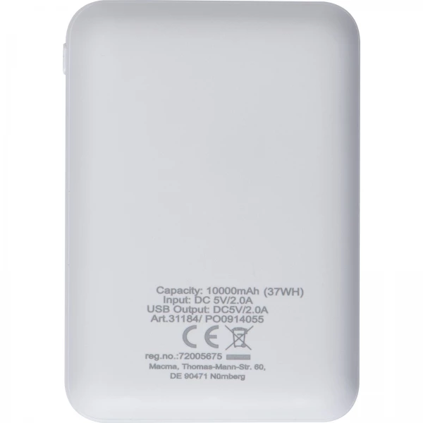 Plastikowy (ABS) power bank o pojemności 10000mAh. Wyposażony w kabel i wyświetlacz, a także 2 wejścia USB do jednoczesnego ładowania 2 urządzeń. Dane techniczne: Output: DC 5V 2000MA (max) Input: DC 5V 2000MA (max) Pojemność: 10000mAh (2 x 5000mAh), Safetyprotection Inne: Dołączony kabelek ze złączami USB A i mikro USB