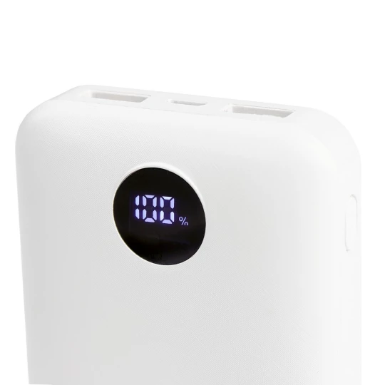 Power bank Air Gifts 10000 mAh, może zmieścić się w kieszeni czy większości przegródek w plecaku, posiada cyfrowy wyświetlacz poziomu naładowania, wejścia 5V/2A: USB-C oraz micro USB, 2 wyjścia USB (max. 5V/2A), możliwość ładowania dwóch urządzeń jednocześnie, w komplecie kabel USB-C oraz filcowe etui z karabińczykiem umożliwiającym przypinanie, produkt wykonany z ABS i filcu