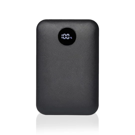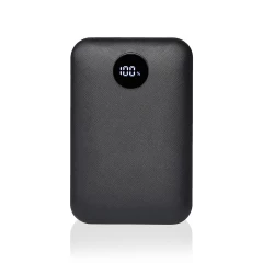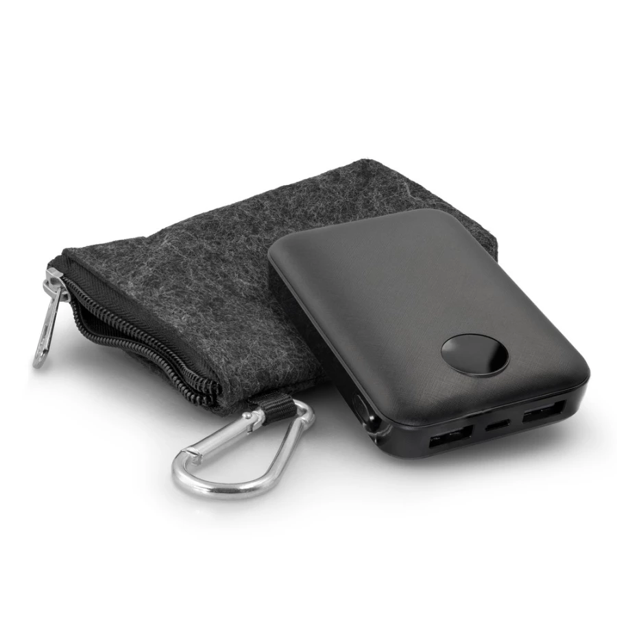 Power bank Air Gifts 10000 mAh, może zmieścić się w kieszeni czy większości przegródek w plecaku, posiada cyfrowy wyświetlacz poziomu naładowania, wejścia 5V/2A: USB-C oraz micro USB, 2 wyjścia USB (max. 5V/2A), możliwość ładowania dwóch urządzeń jednocześnie, w komplecie kabel USB-C oraz filcowe etui z karabińczykiem umożliwiającym przypinanie, produkt wykonany z ABS i filcu