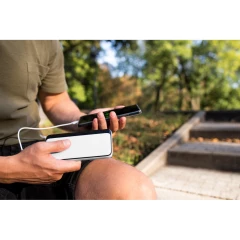 Power bank 10000 mAh, posiada cyfrowy wyświetlacz poziomu naładowania, wejście USB-C 5V/3A, 2 wyjścia USB-C 5V/3A oraz wyjście USB 5V/3A, możliwość ładowania trzech urządzeń jednocześnie, kabel USB-C do USB-C w komplecie, produkt wykonany z ABS