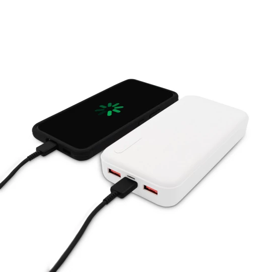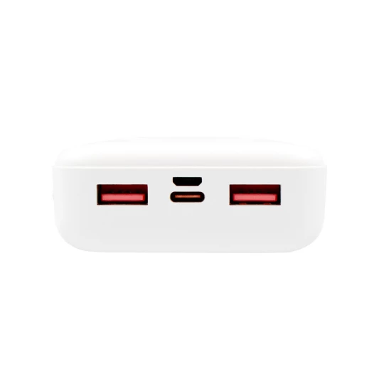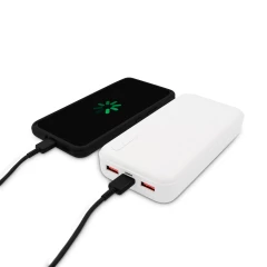Power bank 20000 mAh z funkcją szybkiego ładowania, 4 diody wskazujące poziom naładowania, wejście micro USB 5V/2A (10W), wejście USB-C 5-12V/1.5-3A (18W), 2 wyjścia USB 5-12V/1.5-3A (18W), wyjście USB-C 5-12V/1.67-3A (20W), możliwość ładowania do 3 urządzeń jednocześnie, kabel USB-C w komplecie