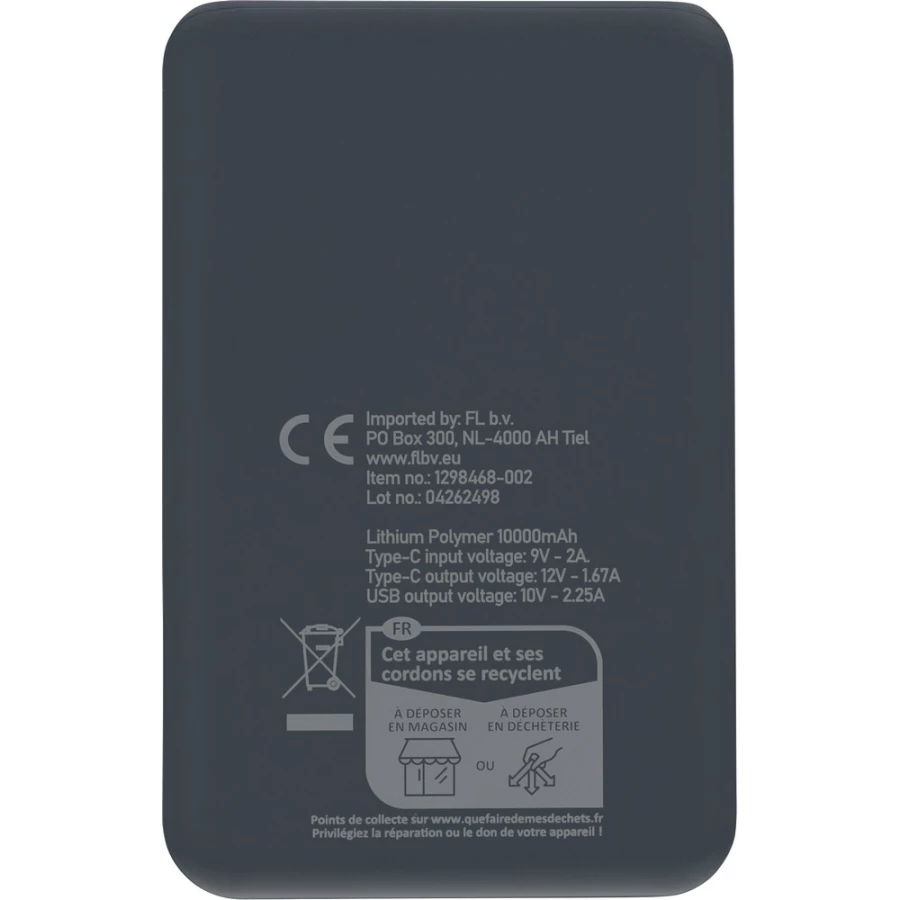 Power bank o mocy 22,5W i pojemności 20000 mAh z baterią litowo-jonową, wejście i wyjście typu C, wejście typu A, etykieta informacyjna z tyłu, ikona RABS na produkcie, posiada zabezpieczenie przed przegrzaniem, zwarciem, przepięciem i przeciążeniem, zapakowany pojedynczo w brązowe kartonowe pudełko, produkt wykonany z ABS z recyklingu
